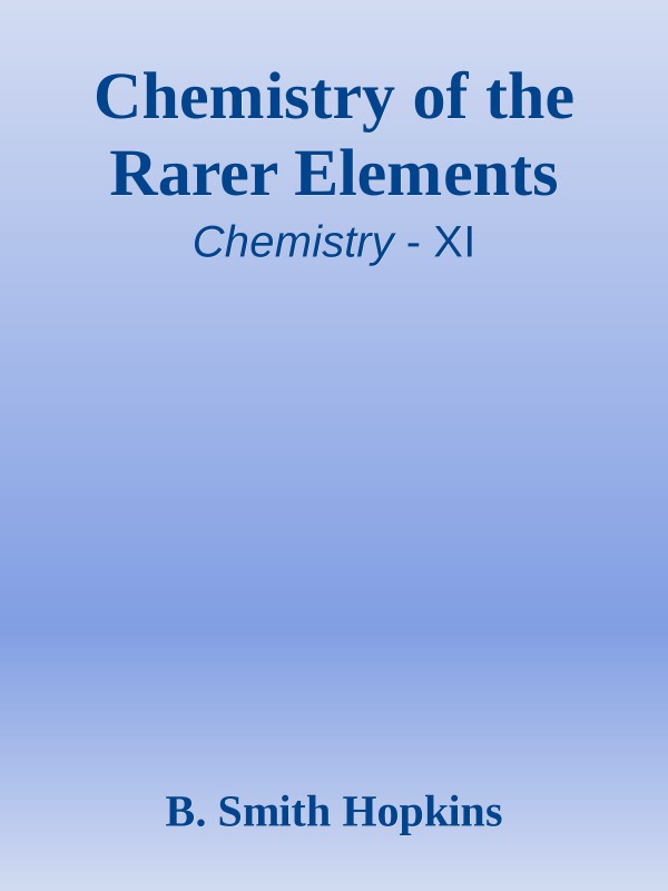 Authors:B. Smith Hopkins , Series:Chemistry [11] , Tags:Chemistry Dictionaries. Dictionary of inorganic chemistry , Author sort:Hopkins, B. Smith , Languages:Languages:eng , Published:Published:Dec 1923 , Publisher:D.C. Heath , Comments:Comments:THE term “rare elements” is conveniently applied to thosemembers of the Periodic Table* whose chemistry in lit fie known.Home of these* elements are so scarce that their study has ofnecessity been difficult; others are abundant in nature*, buttheir development has been retarded by lack of sufficient interest;still others have only recently been discovered, and sufficienttime has not yet elapsed for them to lose the interest inherentin newness. The “rare elements1* then should be understoodto include? those elements which are little known either becauseof scarcity, neglect, or ignorance. The chemistry of norm* ofthese elements is developing rapidly, since* we are junt beginningto appreciate something; of their interest and usefulness. Rapidadvancement, has followed such an awakening,, and the namesof Home Htich substances have become household word*. Inother cases interest has been less keen and advancement hasbeen slow.