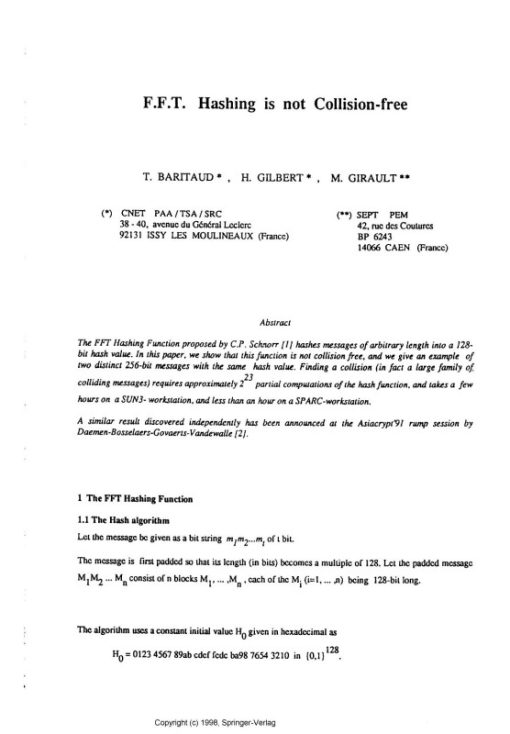 FFT hashing is not collision free 1st Edition by Baritaud T, Gilbert H, Girault M – Ebook PDF Instant Download/Delivery.