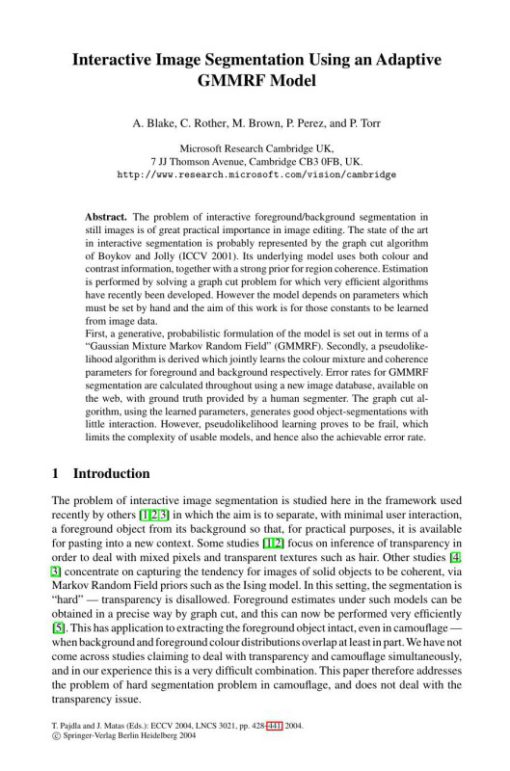 Interactive Image Segmentation Using an Adaptive GMMRF Model 1st Table of contents:
