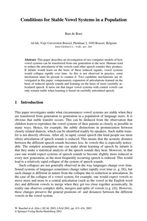 LNAI 2801 Conditions for Stable Vowel Systems in a Population 1st Edition Table of contents: