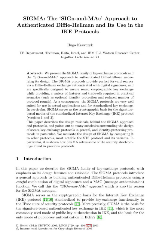 LNCS 2729 – SIGMA: The `SIGn-and-MAc’ Approach to Authenticated Diffie-Hellman and Its Use in the IKE Protocols 1st Edition Table of contents: