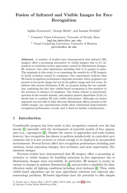 Abstract. A number of studies have demonstrated that infrared (IR) imagery offers a promising alternative to visible imagery due to it’s in- sensitive to variations in face appearance caused by illumination changes. IR, however, has other limitations including that it is opaque to glass. The emphasis in this study is on examining the sensitivity of IR imagery to facial occlusion caused by eyeglasses. Our experiments indicate that IR-based recognition performance degrades seriously when eyeglasses are present in the probe image but not in the gallery image and vice versa. To address this serious limitation of IR, we propose fusing the two modali- ties, exploiting the fact that visible-based recognition is less sensitive to the presence or absence of eyeglasses. Our fusion scheme is pixel-based, operates in the wavelet domain, and employs genetic algorithms (GAs) to decide how to combine IR with visible information. Although our fusion approach was not able to fully discount illumination effects present in the visible images, our experimental results show substantial improvements recognition performance overall, and it deserves further consideration.