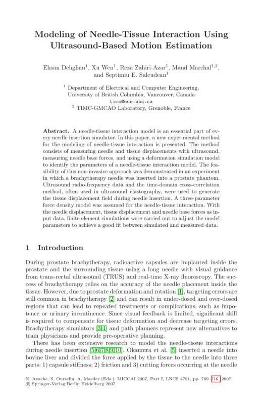 Modeling of Needle Tissue Interaction Using Ultrasound Based Motion Estimation 1st Table of contents: