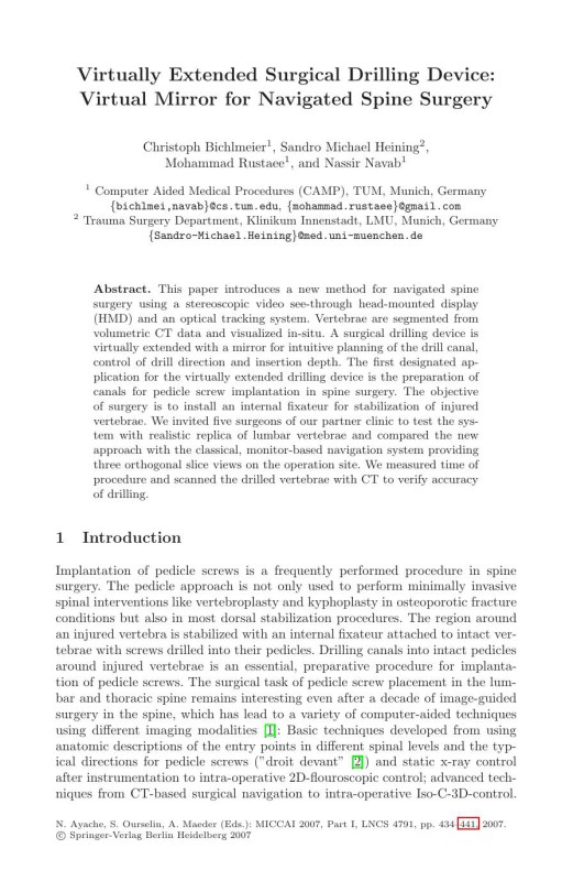 Virtually Extended Surgical Drilling Device Virtual Mirror for Navigated Spine Surgery 1st Table of contents: